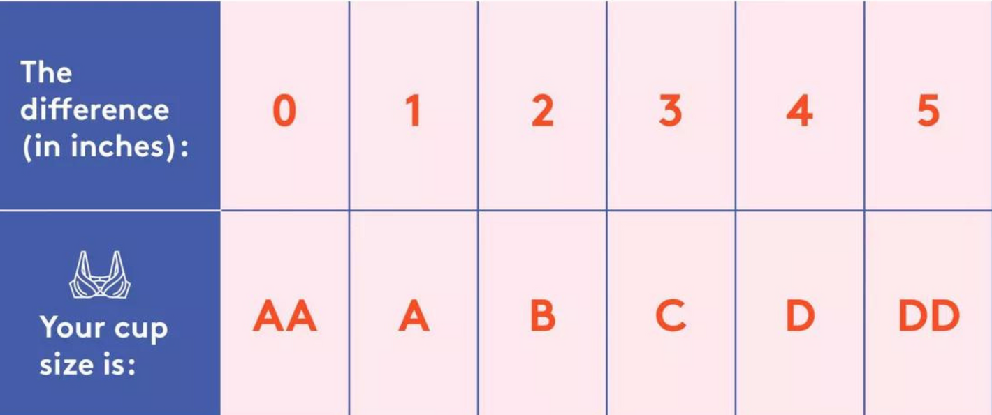 For example, if your measurements are Band Size = 34 and Bust Size = 35, we can find your Cup Size by taking 35-34=1, which is an A Cup. Your Bra Size is 34A!